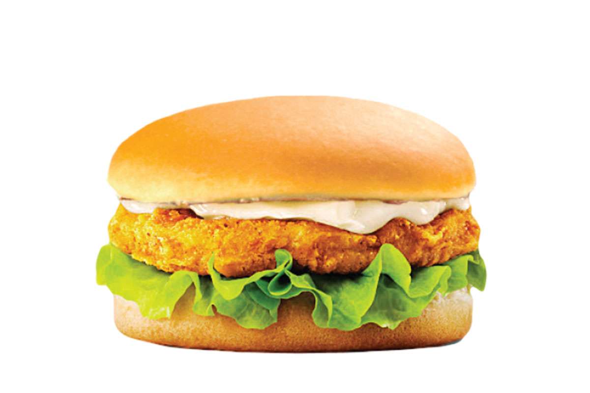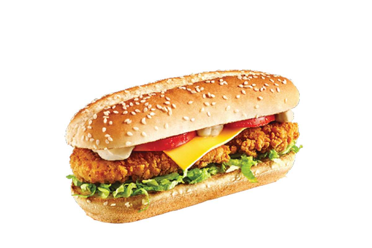 A spicy long seed burger with sesame seeds. In this 2 large tenders with garlic sauce, fresh iceberg lettuce, cheddar and jalapenos.