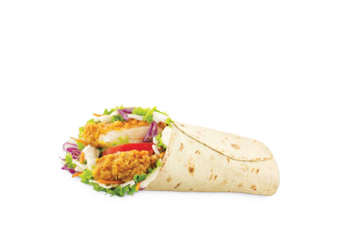 A delicious chicken wrap containing 2 large chicken tenders! Accompanied by fresh iceberg lettuce, cheddar and tomato, this is the ideal choice for the enthusiast.